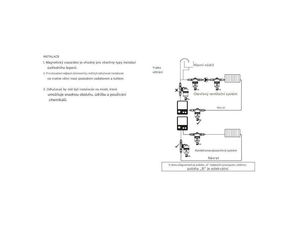 Filtr se doporučuje instalovat na vratné potrubí mezi poslední radiátor a kotel, ve svislé poloze s vypouštěním směrem dolů, aby byla zajištěna maximální účinnost a snadná údržba.