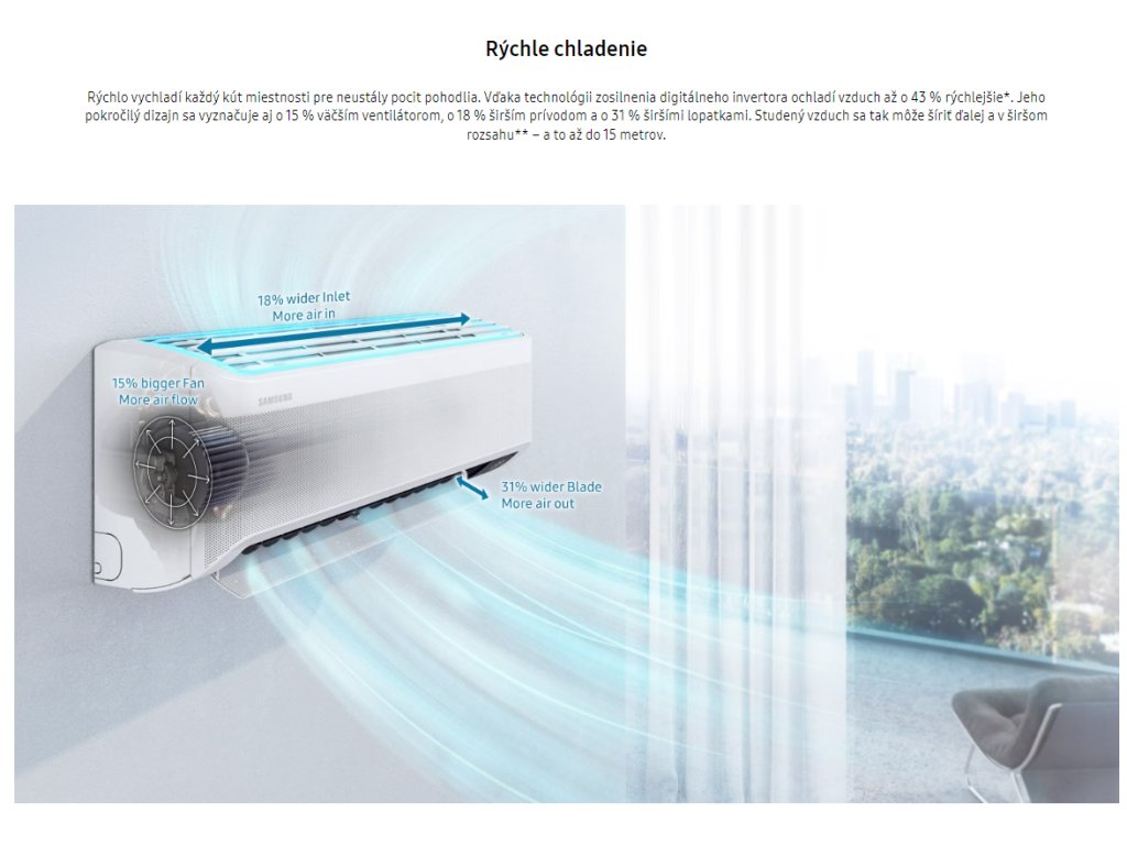 - Rychlé chlazení – chladí rychleji a do všech směrů i větších prostor